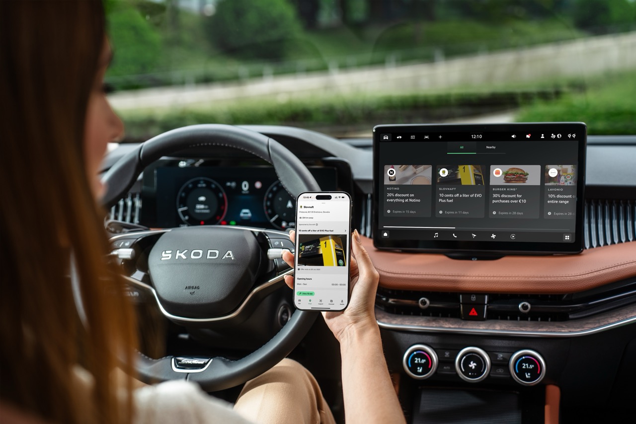 Aplikace v infotainmentu funguje jako digitální slevová knížka, kde řidiči najdou nabídky a tipy nejen od Škoda Auto, ale i od dalších partnerů. Uživatelé si mohou zaslat slevový poukaz na e-mail nebo se nechat odnavigovat přímo na pobočku. Majitelům elektrických vozů se navíc zobrazí nejbližší nabíječka poblíž dané pobočky. Stejný obsah je dostupný také v aplikaci MyŠkoda, kde jsou partneři s aktuálními nabídkami zvýrazněni na mapě.